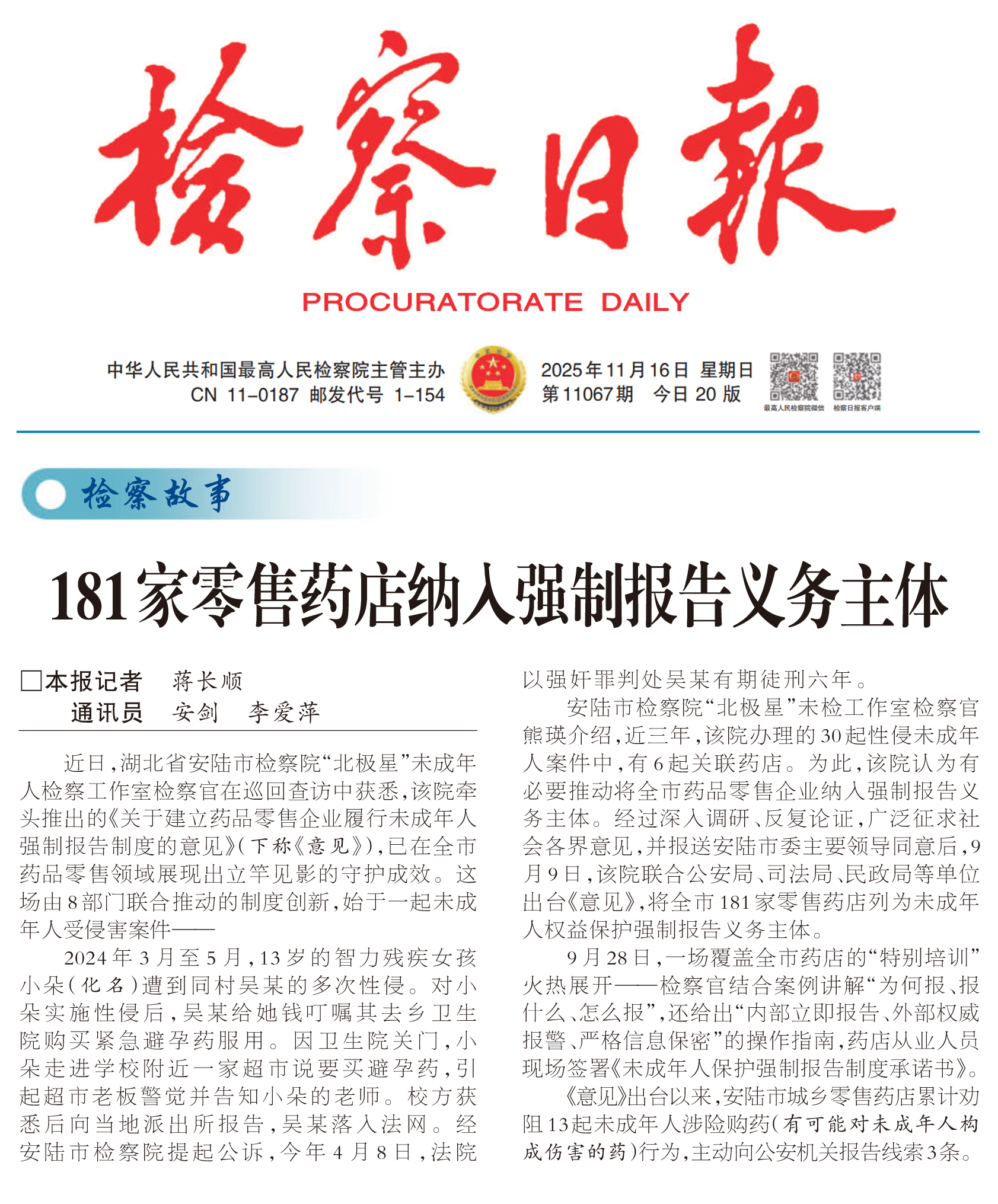 安陆市检察院“北极星”未检工作室检察官熊瑛介绍,近三年,该院办理的30起性侵未成年人案件中,有6起关联药店。为此,该院认为有必要推动将全市药品零售企业纳入强制报告义务主体。经过深入调研、反复论证,广泛征求社会各界意见,并报送安陆市委主要领导同意后,9月9日,该院联合公安局、司法局、民政局等单位出台《意见》,将全市181家零售药店列为未成年人权益保护强制报告义务主体。