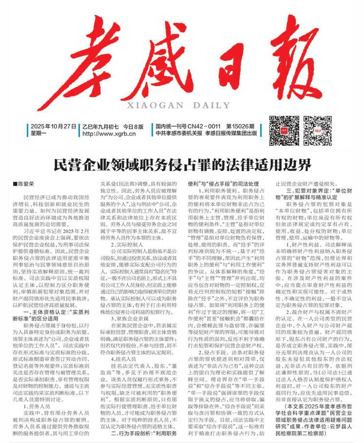 (本文系2025年度孝感市哲学社会科学重点课题“民营企业领域职务侵占法律适用疑难问题研究”成果。作者系云梦县人民检察院职务犯罪检察部主任陈爱荣)