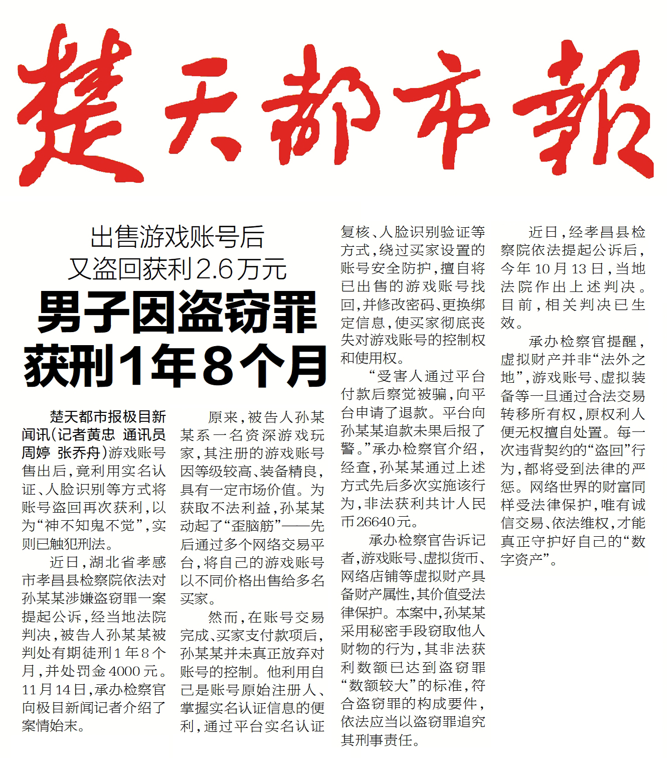 承办检察官告诉记者,游戏账号、虚拟货币、网络店铺等虚拟财产具备财产属性,其价值受法律保护。本案中,孙某某采用秘密手段窃取他人财物的行为,其非法获利数额已达到盗窃罪“数额较大”的标准,符合盗窃罪的构成要件,依法应当以盗窃罪追究其刑事责任。